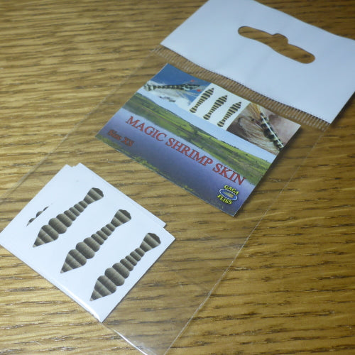 Magic Shrimp Skin is back material for shrimp imitations. Made of thin vinyl and each skin is precutted to shape. Slightly adhesive surface makes placing the skin on the hook easy. Coat with UV glue/varnish for three dimensional look.