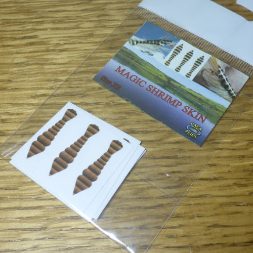 Magic Shrimp Skin is back material for shrimp imitations. Made of thin vinyl and each skin is precutted to shape. Slightly adhesive surface makes placing the skin on the hook easy. Coat with UV glue/varnish for three dimensional look.