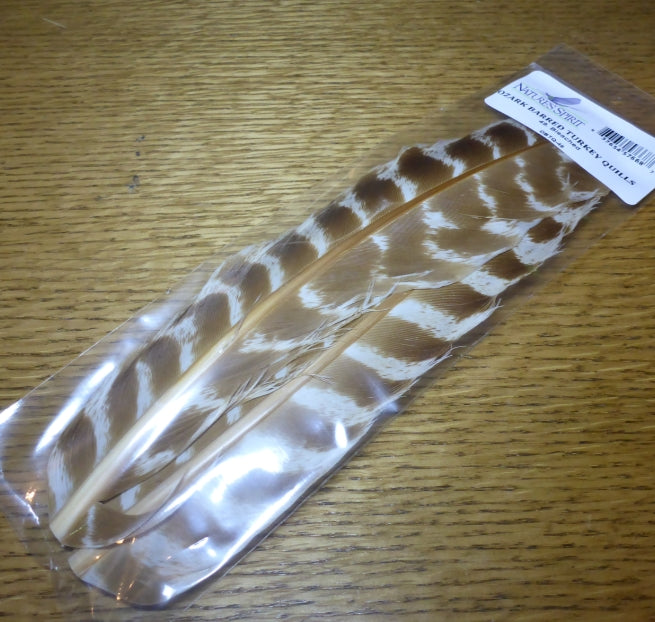 Each pair of Nature’s Spirit Ozark Barred Turkey Quills feathers is matched for color and mottling. These are excellent featherst for muddler wings, hoppers and nymph cases. A thing layer of a flexible cement or UV resin will hold the fibers together to create long lasting hopper wings. One matched pair per pkg.
