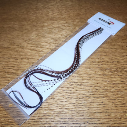 This pack includes 6 Grizzly Feathers and 6 Dark Brown Feathers, perfect for tying the Adams fly, the Parachute Adams, or a Stimulator, where the two colours are required. Mixed feathers mostly in the #10 – #16 size range. These include select feathers from both Whiting and Hebert Miner saddles, and are all high quality dry fly tying feathers.