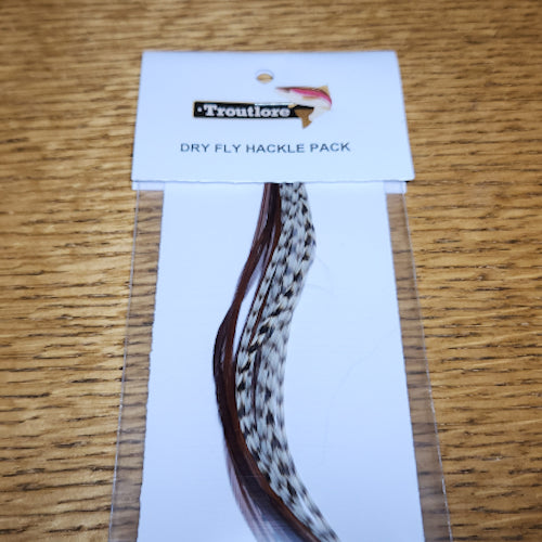 Introducing the Troutlore Dry Fly Hackle Pack, which features a selection of long hackle feathers perfect for a range of dry fly tying applications. Each pack contains 12 feathers, ranging between 10 and 16 inches. Extra feathers are added if any are shorter than this. These will tie up to 20 flies per feather, depending on the size and pattern being tied. Obviously, a sparse Catskills fly uses a lot less hackle wraps that a fully wrapped Stimulator.