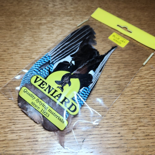 Veniard Jay Whole Wings offer lots of useable plumage and quills. The striking blues are used for lots of trout and salmon patterns.The blue barred feathers from the wings of this wide ranging bird have been used by tiers of salmon flies since the nineteenth century. Trout, lake, bass and seatrout flies use these feathers.